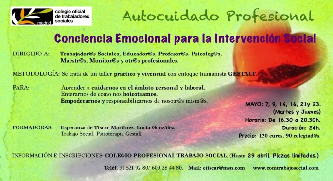 CURSO: Auto-cuidado Emocional para el Ambito Personal y Profesional. COLEGIO PROFESIONAL TRABAJO SOCIAL DE MADRID. Abierto a todas las profesiones.